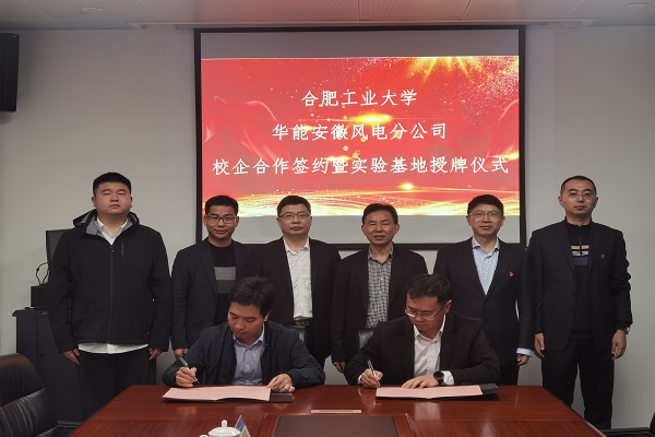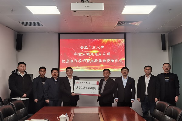 双方共同观看了合肥工业大学2022年招生宣传片和中国华能集团安徽风电分公司宣传片,李丽鹏与副总经理郭海全代表校企双方签署《合肥工业大学大学生就业实习基地协议书》,叶绍灿与邱先佳共同为“合肥工业大学就业实习基地”揭牌。根据协议,双方将在人才培养、学生实习就业等方面展开全方位合作。同时,双方将进行更深层次的产教融合探索,加快科技研究成果向产业技术转化和产品产出,提高社会服务能力。