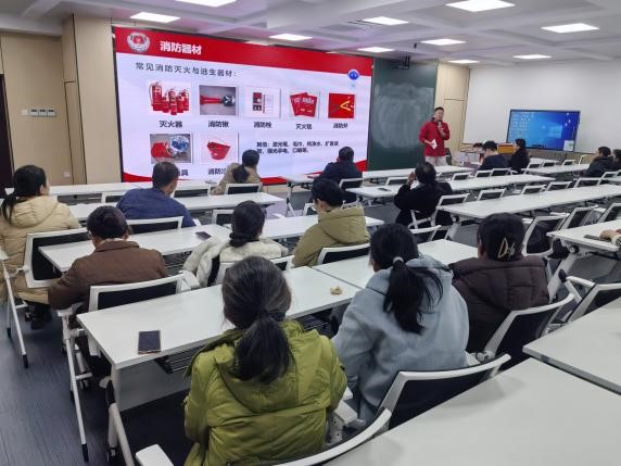 讲座内容主要包括几起伤亡惨重的高校火灾警示案例,火灾类型、预防与处置,消防器材相关知识,火灾逃生基本技巧和自救方法,灭火器的检验及使用方法,以及如何正确报警等。