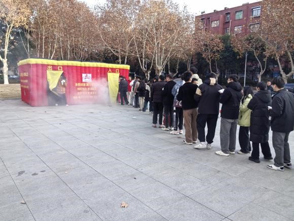 演习内容包括在施放烟雾的小黑屋逃生与干粉灭火器实操演练,以掌握基本的火场逃生技能与干粉灭火器使用方法。
