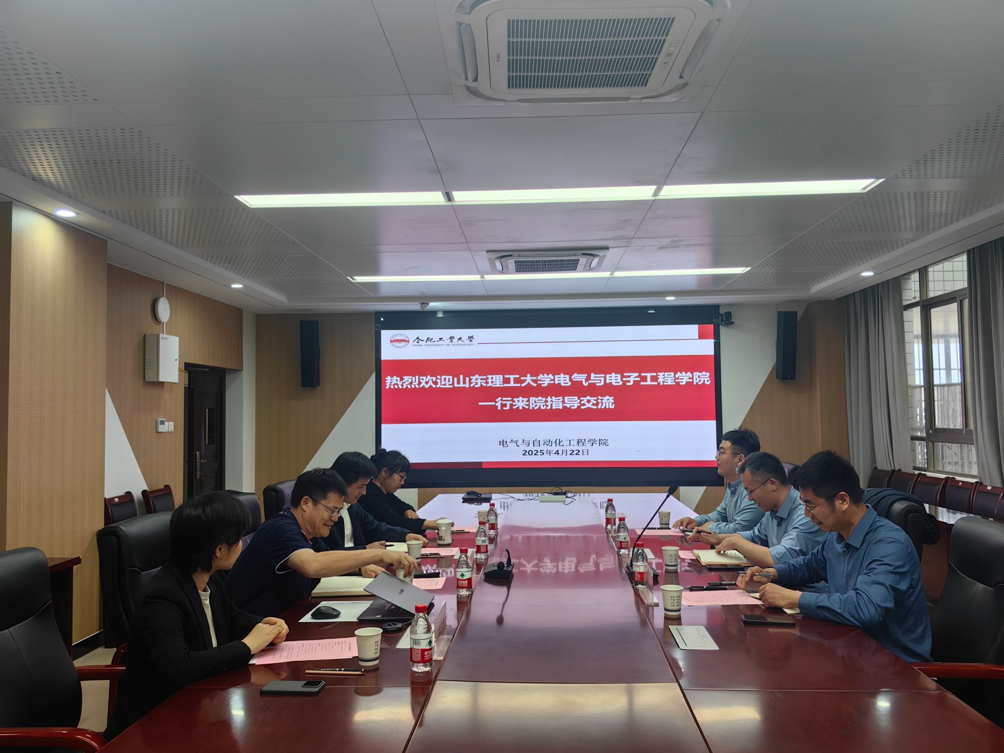冯航对山东理工大学电气与电子工程学院一行的到来表示了热烈的欢迎,吴红斌详细介绍了合肥工业大学电气与自动化工程学院的组织架构、师资队伍、学科平台建设、人才培育和科学研究等方面的发展现状。焦提操对学院的热情接待表示感谢,高明亮介绍了山东理工大学电气与电子工程学院的发展历程及其在学科建设、科研工作、竞赛获奖以及教学平台建设等方面的办学情况和发展需求,并阐明了此次交流目的。焦提操指出,合肥工业大学电气与自动化工程学院在特色学科建设和行业结合等方面有许多值得借鉴和学习的地方,希望通过此次调研,能够进一步深化合作,实现资源共享、互惠共赢,共同推动电气工程学科的高质量发展。