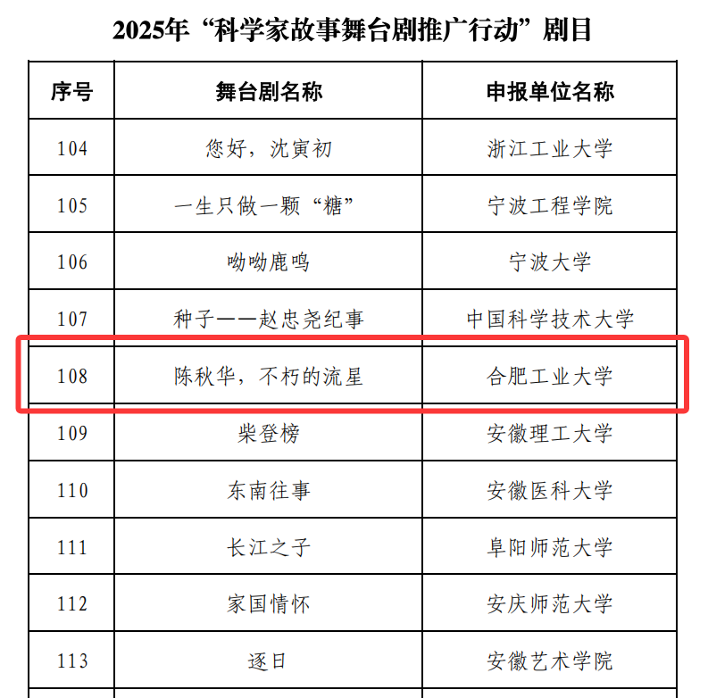 7月9日,中国科协发布了2025年“科学家故事舞台剧推广行动”剧目的通知,公示了“科学家故事舞台剧推广行动”剧目名单,我院作品《陈秋华,不朽的流星》成功入选立项。