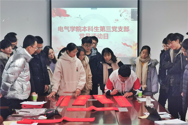 为弘扬崇廉尚洁、风清气正的廉政文化,传递新春佳节之际的节日祝福,电气与自动化工程学院本科生第三党支部于2021年1月9日举办主题为“弘扬廉洁文化,书写廉政春联”的主题党日活动。