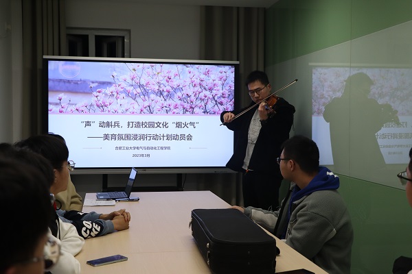为丰富学生课余生活,陶冶心灵情操,3月3日晚,电气与自动化工程学院在屯溪路校区5号宿舍楼社区会议室开展美育第一课——“声动斛兵,奏响青春”美育浸润活动。学院美育工作指导老师左能和本科生参与了活动。