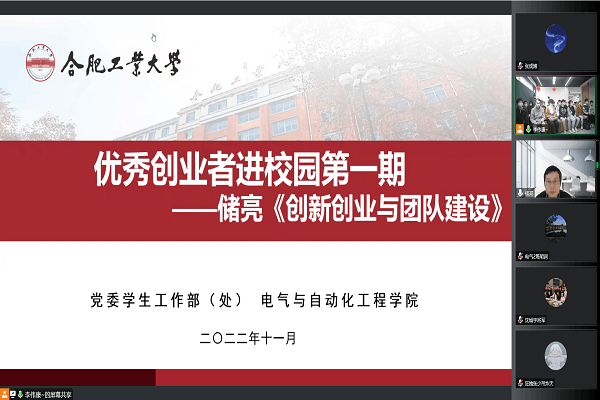 11月9日,由党委学生工作部组办,电气与自动化工程学院承办的“优秀创业者进校园”第一期创新创业专题报告会采取线上线下同步收听的方式在屯溪路校区学生公寓五号楼大学生成长社区开展,报告会诚邀学校2005级电气工程及其自动化专业校友储亮先生为全校各学院2023届毕业生作创新创业方向的指导交流。