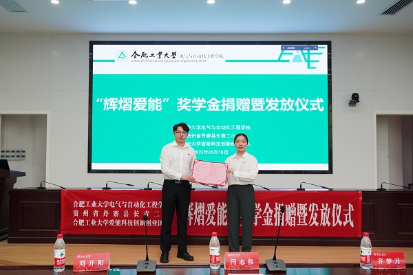 “辉熠爱能”奖学金由“爱能科技”大学生创新实践团队(电气工程及其自动化创新实验19-1班学生董磊、电气工程及其自动化19-3班学生李浩然、计算机科学与技术19-2班学生袁泰立)发起,将他们在第十四届中国大学生计算机设计大赛中获得一等奖的竞赛奖金五千元,捐赠给学校研究生支教团服务地贵州省丹寨县长青二小,鼓励支持偏远地区的孩子们认真努力学习,培育创新意识,树立远大理想,厚植爱国情怀。(刘开阳/文、图 李丽鹏/审核)