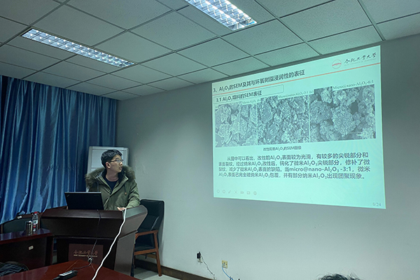 第一位分享者是麦宇翔同学,他汇报的主题是:微/纳米结构Al2O3对环氧复合材料电气性能及导热性能影响研究。有机-无机界面对于材料的性能有至关重要的影响,麦宇翔同学在综合考察了复合材料的力、热、电性能后,研究发现改性后的Al2O3由于界面结合强度的提升,其各项性能均有不同程度的提高。并且热刺激电流的测试结果显示,结合更好的界面为深陷阱的产生提供了有利条件。同时,麦宇翔同学为现场的同学们分享写作经验和对于研究的看法。