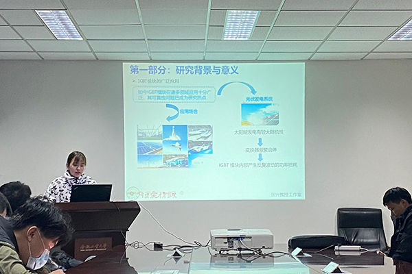 第四位分享者是孟娜同学,他汇报的主题是:基于创建非干预性监测环境的IGBT模块在线监测系统的研究与设计。孟娜同学创新性地提出了一种在线监测3LNPC逆变器中IGBT模块的新思路,注入监测电流来获取用于判断键合线老化状态的电压、结温参数。孟娜同学所设计的在线监测系统已集成为即插即用的平台,可以更好地实现逆变器在线工作时的现场监测。孟娜同学对自己的研究方向以及自己的学习方法和同学们进行了交流分享。