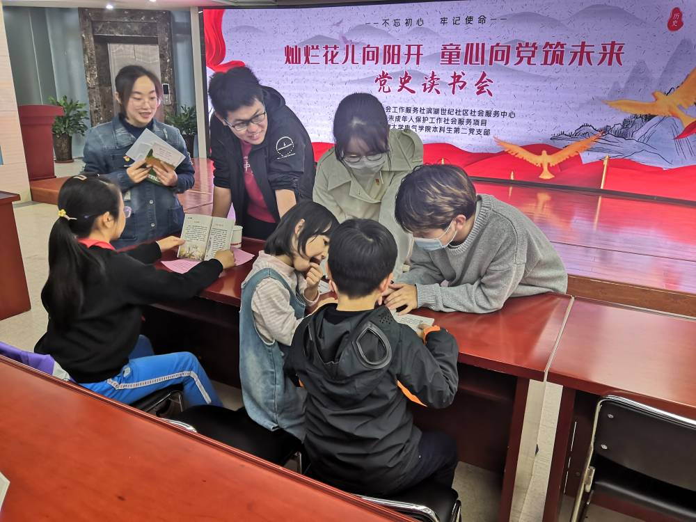 正值中国共产党建党百年之际,为进一步贯彻落实好党史学习教育任务,努力做到学史明理、学史增信、学史崇德、学史力行,10月22日下午,电气与自动化工程学院本科生第二党支部赴滨湖世纪社区服务中心开展“灿烂花儿向阳开,童心向党筑未来”读书会主题党日活动,以学党史,悟思想为核心,与小朋友们一道学习党的历史故事。