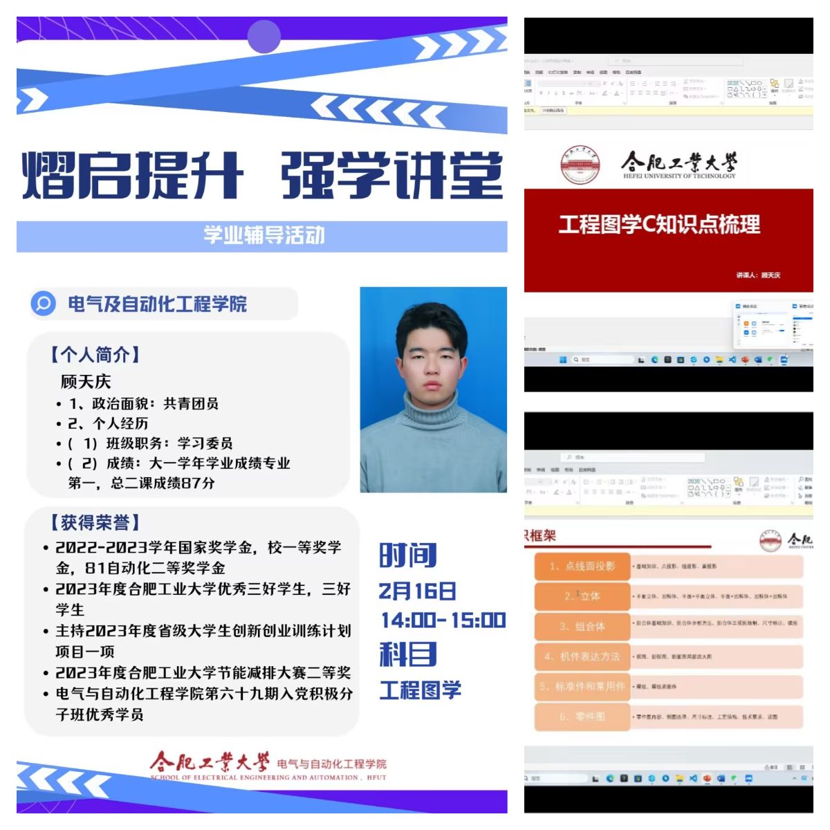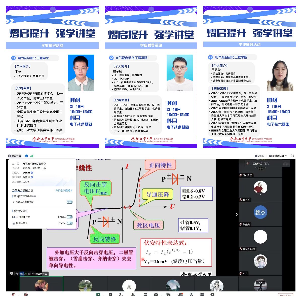2月16日至2月18日,电气与自动化工程学院开展“‘熠’启提升,强学讲堂”线上学业辅导活动,学院建立“骨干教师+朋辈讲师”学业导师队伍,各年级调研摸排学生需求,针对《电力电子技术》,《电子技术基础》,《线性代数》,《工程图学》等课程开展学业辅导,帮助学生掌握学习方法,把握重点难点,增添学习动能,树立学业信心,顺利通过考试,学院150余名学生参加活动。