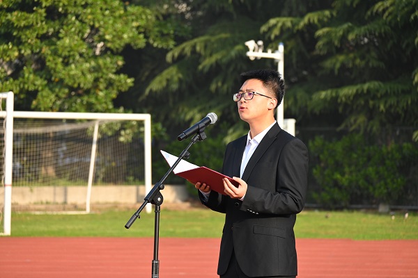随后,2020级本科生党员田一麟在国旗下做主题演讲《学习两会精神,争做有为青年》。田一麟从自身的学习实践经历出发,讲述了自己在大学四年里勤学奋进、自强不息、勇担责任的成长经历。他在各个领域积极挑战自我,在专业学习、科创项目的重重历练下提升自己,并为学校社区、学院党支部积极奉献。他用激昂的声音和满腔的热情告诉同学们在最该吃苦的年纪不应选择安逸,作为新时代青年的我们要勇于迎难而上,明确自己肩负的使命,为强国建设和民族复兴贡献青春力量,号召同学们面对新发展、新需求,要牢抓强国建设、民族复兴的接力棒,做坚持学习、勇担责任、乐于吃苦的新时代有为青年。