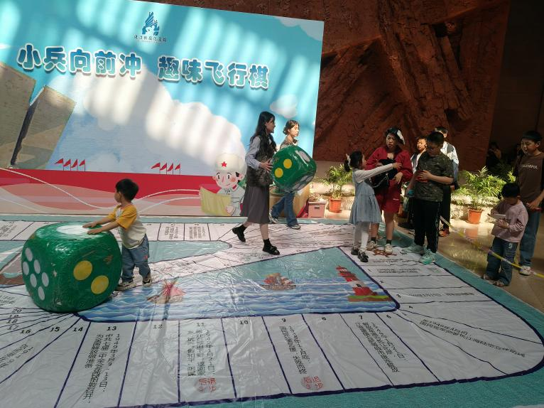 互动体验悟初心,红色精神共传承。进入会馆,志愿者与游客们共同开启“沉浸式”红色之旅。在“飞行棋”互动环节,志愿者化身历史讲解员,将渡江战役的关键节点、英雄事迹融入游戏关卡,全程讲解关卡背后的历史意义,带领大家重温“打过长江去,解放全中国”的壮阔豪情,让“不畏艰险、团结奋进”的渡江精神具象化、生动化,让参与者在“步数前进”中感受革命先辈的艰辛与荣耀,用脚步丈量历史厚度。