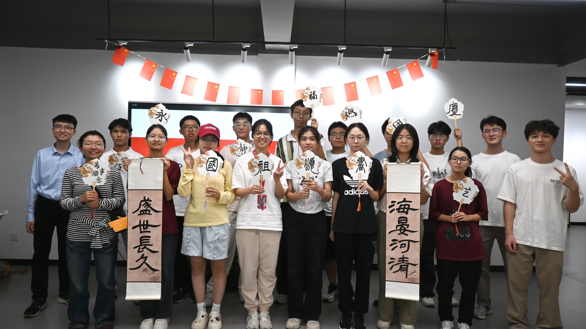 活动主持人带领同学们回顾了新中国成立以来波澜壮阔的发展历程,以详实史料与生动讲解引发了同学们的深入思考和热烈讨论,进一步增强对国家发展道路的理解与认同。与会师生以笔墨书为媒介,在团扇上书写“国泰民安”“风华正茂”等词语,在一撇一捺的书写中用艺术表达爱国情怀。最后,全体师生齐声合唱《我和我的祖国》,真挚歌声中洋溢着青春的激情与不变的赤子之心。