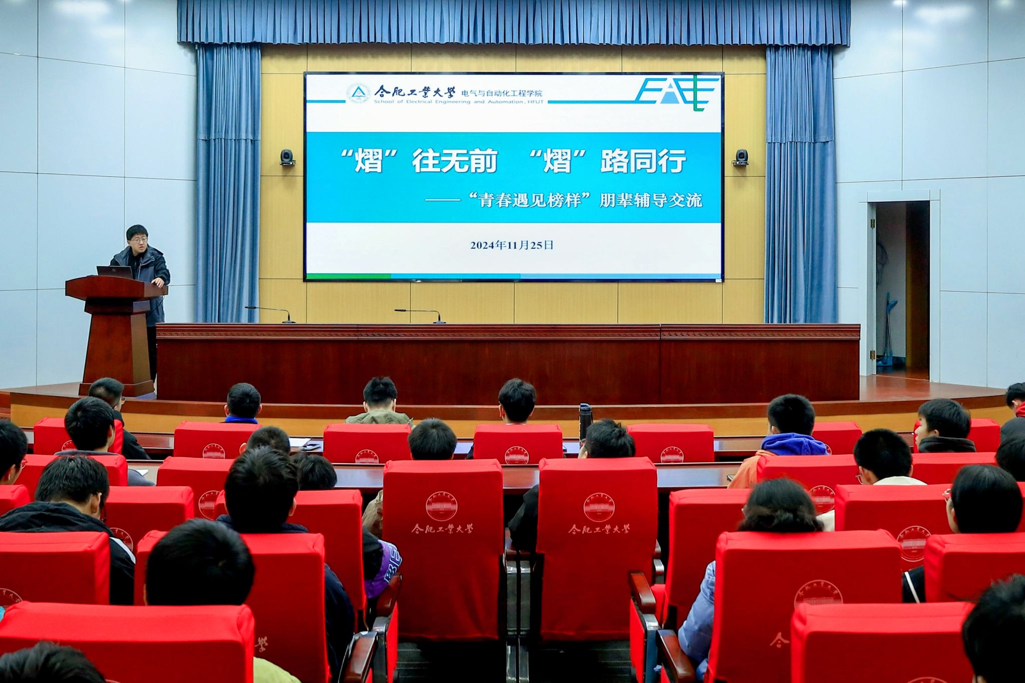 为充分发挥党员先锋模范作用,凝聚朋辈同侪共进力量,全方位促进学生成长成才,11月25日晚,电气与自动化工程学院于学术会议中心一楼大报告厅开展“熠往无前,熠路同行”朋辈辅导。学院相关负责老师、朋辈主讲嘉宾、党员代表、班级团学骨干、党团班学员等200余名本科生及研究生参加活动。