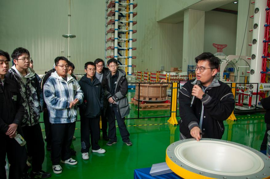 在高电压与绝缘技术实验室,讲解员结合展板与实物模型,系统介绍了航空器、轨道交通在雷电环境下的防护原理,重点展示了实验室针对低空全域不同微气象灾害的模拟试验平台与强电磁效应模拟实验系统,详细介绍了国内首个集“雷电主动调控-雷电监测预警-雷电防护”于一体的综合大型雷电科学研究平台。班主任赵毅老师带领同学们围绕设备原理、技术应用、学科前景等问题开展热烈讨论,并解答同学们的困惑,帮助大家理清专业认知、明晰学习方向,激发了同学们深耕专业学习、探索科技前沿、助力国家重大战略的热情。